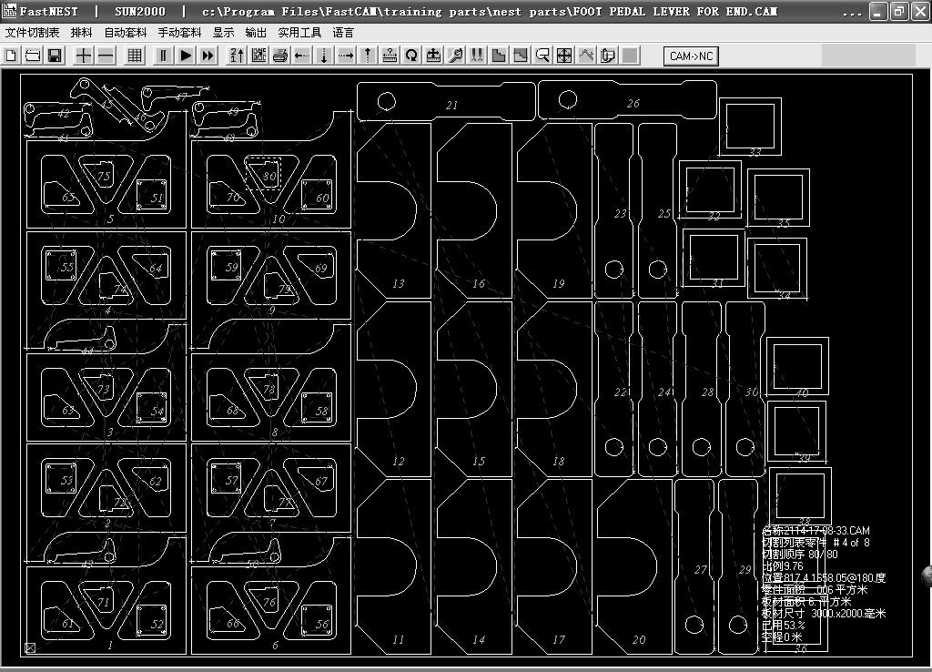 FastCAM 全自動套料軟件主要用于繪圖、套料、切割工藝編程、NC 程序校驗與模擬、鋼材與加工成本統計報表、NC 與DXF/CAM/NC 文件轉換等。